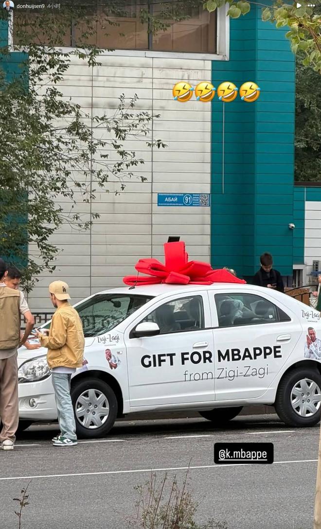 在唐尼-赫伊森曬出的照片當中可以看到,阿拉木圖當?shù)赜幸幻蛎园岩慌_汽車包裝上了禮物的包裝,上面印有一些姆巴佩的照片,并印著“送給姆巴佩的禮物,來自Zigi-Zagi”。